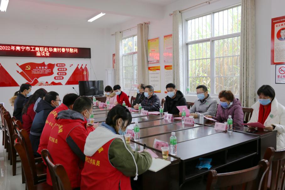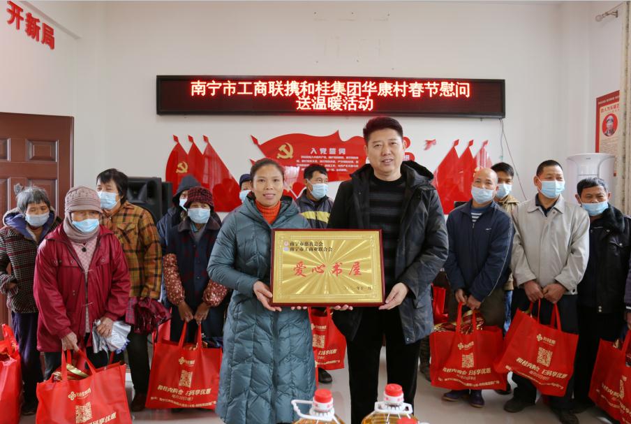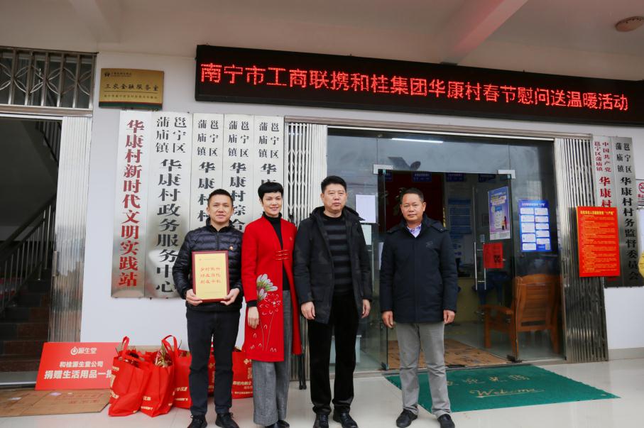 1月17日,南寧市委統(tǒng)戰(zhàn)部副部長、南寧市工商聯(lián)黨組書記李忠南率隊,由南寧市工商業(yè)聯(lián)合會、和桂集團黨支部、南寧梧州商會的相關黨員同志組成的慰問組一行,走進邕寧區(qū)蒲廟鎮(zhèn)華康村開展走訪慰問活動。座談會上,慰問組一行聽取駐華康村第一書記韋傾人工作匯報、研究所聯(lián)系村鄉(xiāng)村振興工作;慰問困難群眾,送上春節(jié)慰問品;李忠南書記向華康村小學贈送“愛心書屋”牌匾;華康村委領導向和桂集團贈送愛心企業(yè)牌匾。