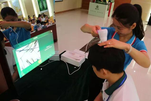 市場部總監(jiān)甘斌在會上向大家介紹了,源生堂獨家定制開發(fā)的4.0版本的頭皮智能檢測儀——“魔鏡”。他表示,“魔鏡的三大保障:魔鏡的智能化、專業(yè)化、多媒體功能給顧客帶來科學的檢測”。魔鏡從專業(yè)的角度,系統(tǒng)地將頭皮頭發(fā)的各種問題分類、分析,從整體到局部都能透徹地進行評估,從而有助養(yǎng)發(fā)顧問為顧客訂制最精確的護理方案。在眾多養(yǎng)發(fā)儀器中,頭皮檢測儀是最重要的儀器之一,它用來檢測頭發(fā)問題的根源,讓消費者清晰地看到自己頭發(fā)的養(yǎng)護前和養(yǎng)護后的對比照,及時了解頭皮健康狀況。