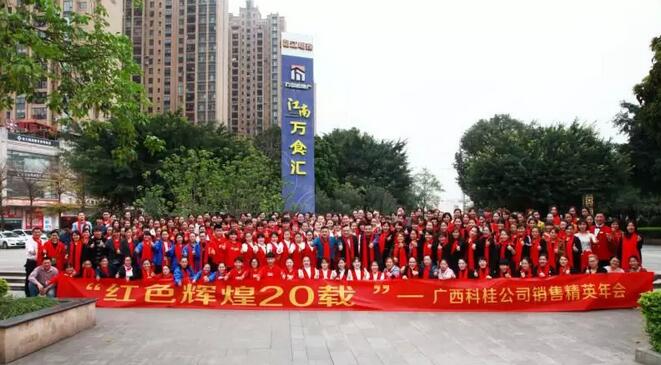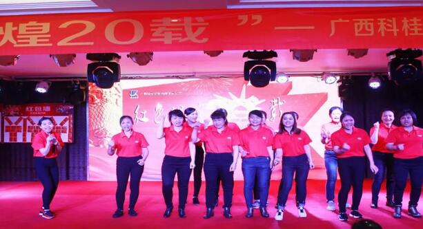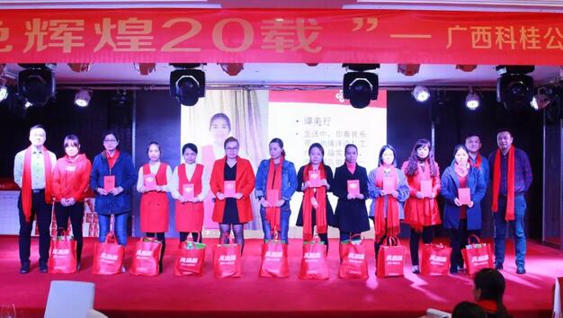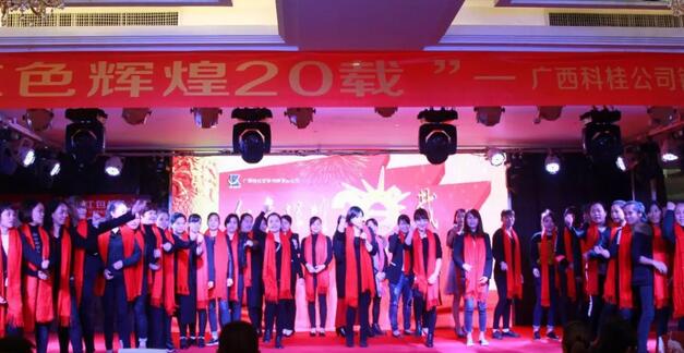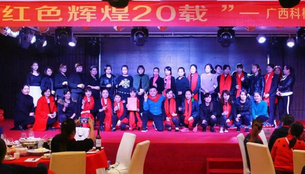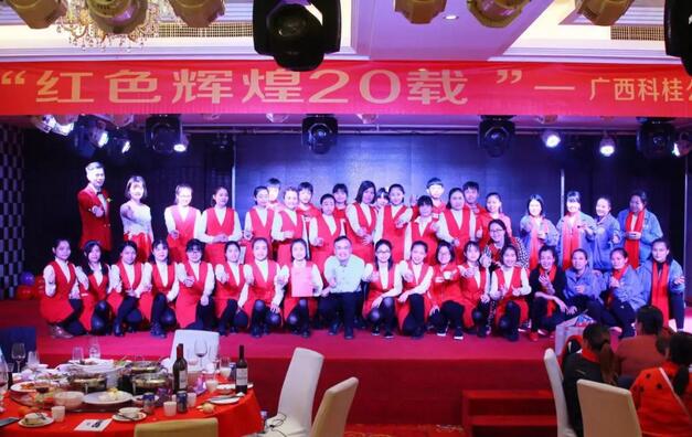 本次年會最大這點是主題以《紅色輝煌20年》講述的是廣西科桂貿(mào)易有限責(zé)任公司是在1998年的6月28日在南寧市桃源路上成立,到今年,剛好20年大慶。本次年會以紅色系為主,所有參會人員從穿衣到裝飾上都可謂是從頭火到腳,寓意我們生意紅紅火火,家庭美美滿滿。